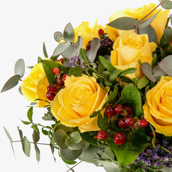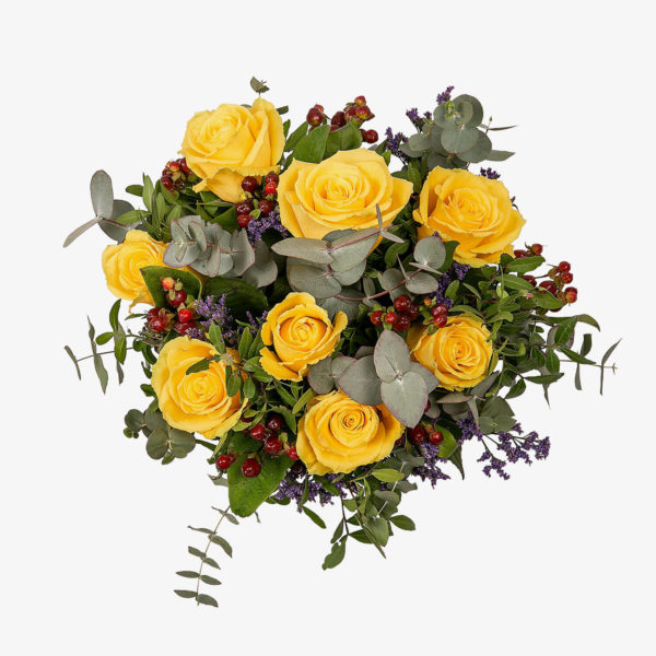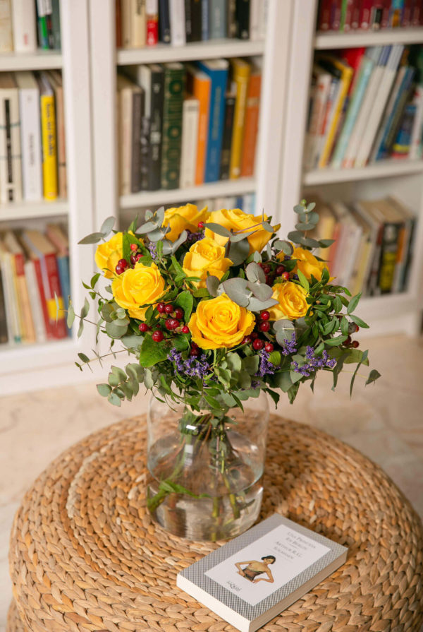 Rosa amarilla, Lentisco, Eucalipto, Hypericum marron y Limonium morado.