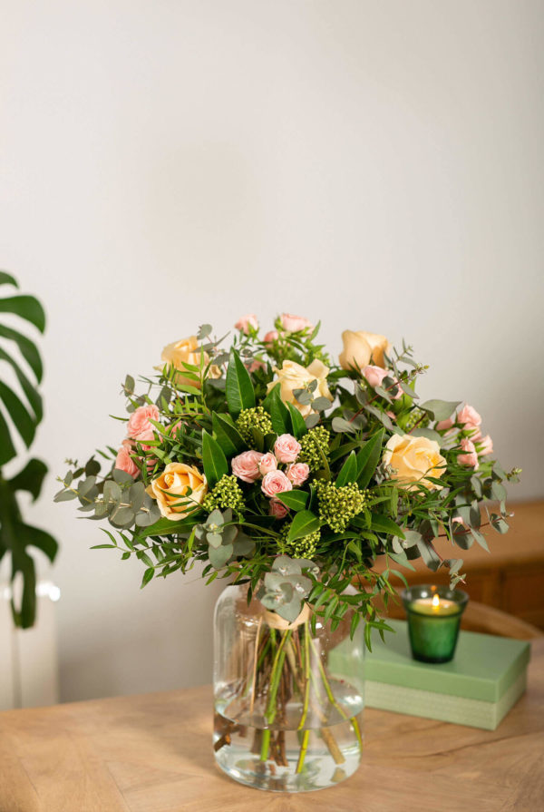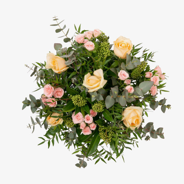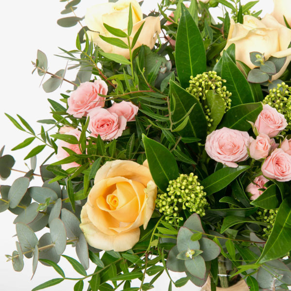 Rosa Melocotón, Ramificada Rosa, Lentisco, Eucalipto y Skimmia verde.