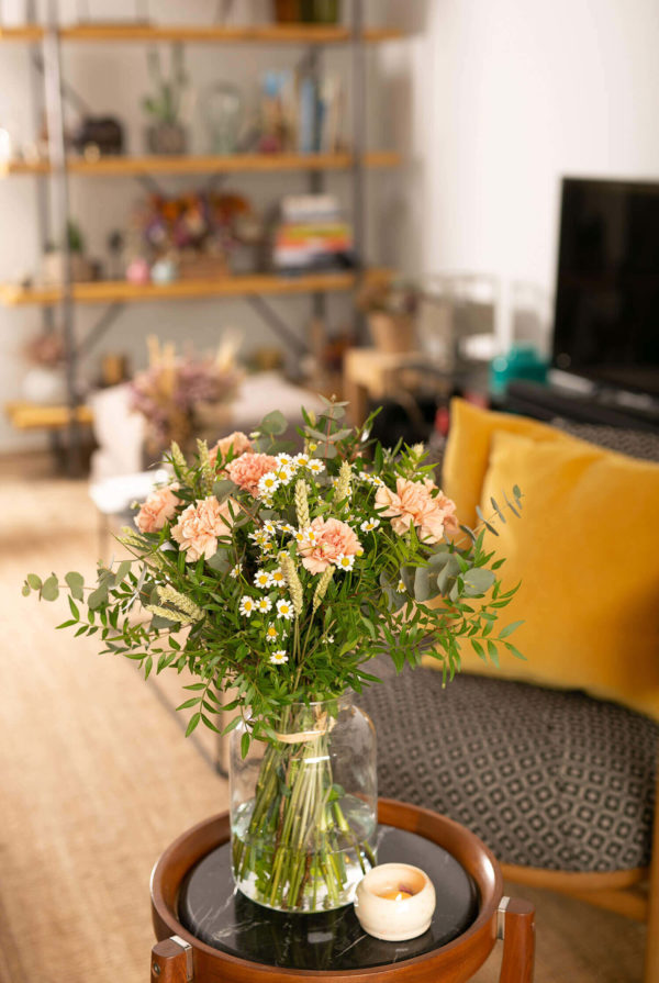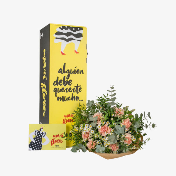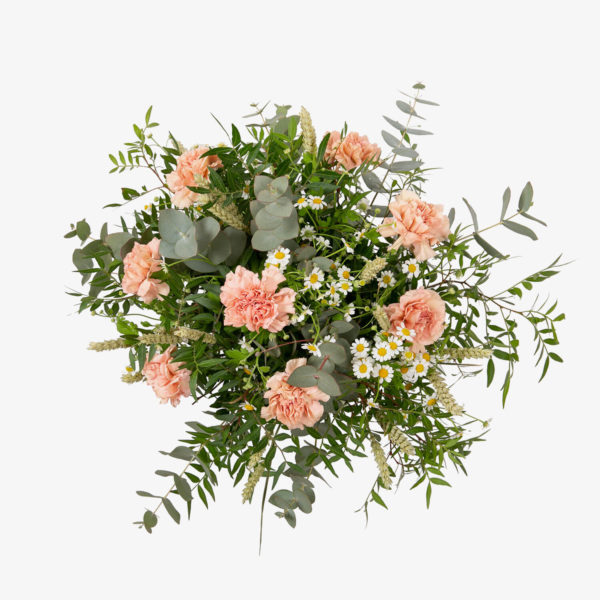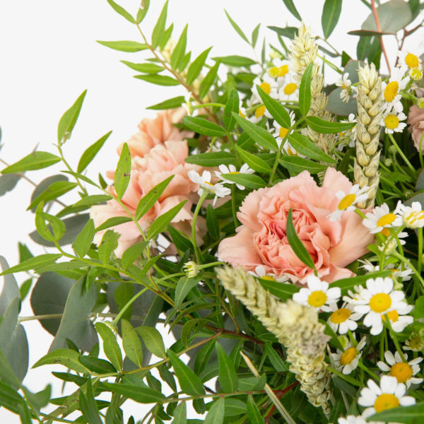 Este ramo es la voz de la experiencia. Claveles envejecidos color pastel combinados con manzanilla y trigo y como fondo el inconfundible verde del eucalipto. Un ramo naturalmente único que enamorará a esos que buscan algo diferente.